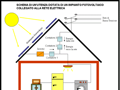 L’energia prodotta dall’impianto fotovoltaico viene convertita dall’inverter e immessa nella rete locale a bassa tensione. Il primo contatore (contatore 1) posizionato dal gestore GSE a valle dell’inverter, conteggia tutta l’energia prodotta dall’impianto, e riconosce al produttore, per venti anni, a seconda della classe di appartenenza definita in base alla potenza, delle tariffe incentivanti che variano al variare della tipologia di impianto e della potenza.